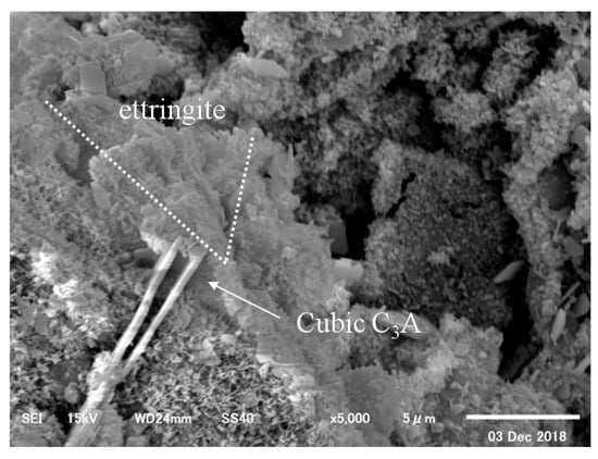 Initially, in the case of CN0, it was found that sulfate (SO42−) ettringite was attached to some parts of the C3A surface of the cement, as shown in Figure 11. Further, as shown in Figure 12, sulfate (SO42−) ettringite and monosulfate were also observed.