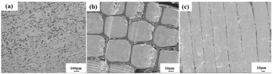 SEM images of wood-metal functional composites: (a,b) cross-section of sample and (c) tangential section of sample.