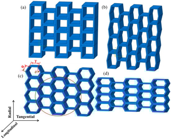Schematic model of the wood cell. (a) θ = 0° and T/R = 1, (b) θ = 20° and T/R = 1, (c) T/R = 1.5 and θ = 30°, and (d) T/R = 3 and θ = 30°.