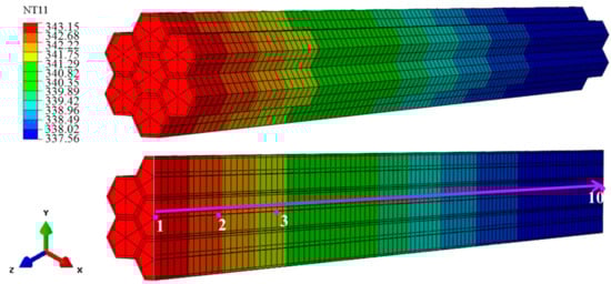 Figure 4 shows the temperature distribution for heat transfer at a time of 120 s, where the lower image shows the longitudinal cross-section. Figure 5 shows the temperature as a function of time at 10 points along the arrow indicated in Figure 4, where 1 is closest to the heating surface and 10 is farthest from the heating surface. Figure 6 shows the temperature distribution at the beginning of heat transfer. Here, T and R were 30 μm, θ was fixed at 30°, and the applied temperature was 343.15 K. Note that the coordinates x, y and z also correspond to the tangential, radial, and longitudinal directions in the wood.