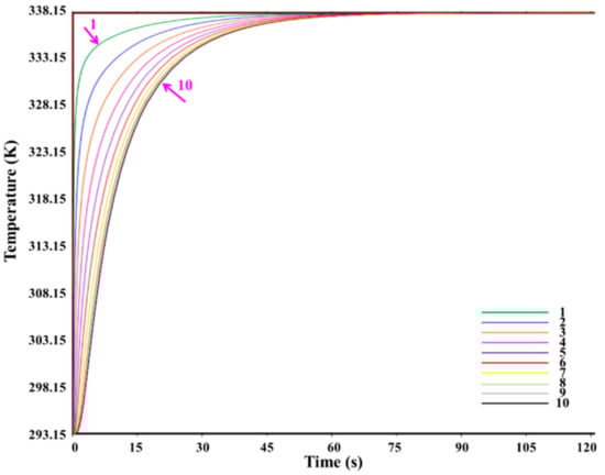 Change of temperature with time at 10 points along the arrow indicated in Figure 4, where 1 is closest to the heating surface and 10 is farthest from the heating surface.