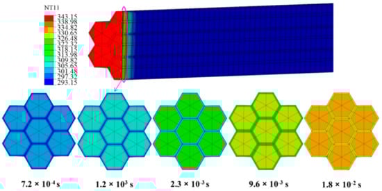 According to Figure 5, after 120 s, the temperature of all points in the composite cell reached approximately 338.15 K over time. Moreover, the heat transfer rate was higher closer to the heating surface. Figure 6 shows the temperature distribution of composite cells 0.02 mm from the heating surface after 7.2 × 10−4, 1.2 × 10−3, 2.3 × 10−3, 9.6 × 10−3, and 1.8 × 10−2 s. The heat transfer rate of the alloy was faster than that of the wood cell wall at the beginning of heating.
