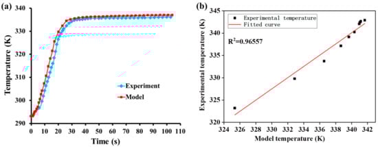Figure 9a shows a comparison between the experimental values and model values; both reached the maximum temperature after approximately 42 s under the same heat conditions, and the trend of heat transfer was predominantly consistent. In Figure 9b, a correlation analysis was performed on the two temperature results, resulting in a correlation coefficient of 0.96557, which confirms the feasibility of the model. The reason for the temperature difference can be summarized as follows: