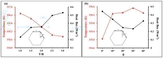 Influence of cell geometry on temperature and heat flux: (a) influence of the T/R ratio and (b) influence of angle θ (T/R and θ are defined in Figure 2).