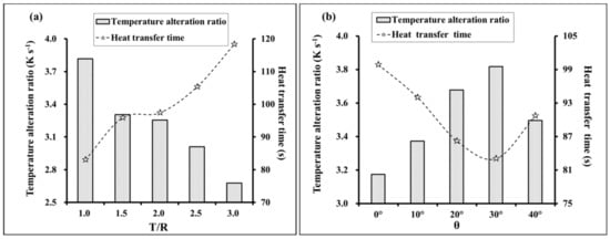 For an increase in T/R from 1.0 to 3.0, the TAR decreased from 3.82–2.68 K·s−1 (a decrease of 29.8%) and the heat transfer time increased from 83.04–118.32 s (an increase of 42.5%). For an increase of θ from 0 to 40°, TAR first increased then decreased, where the increase of 3.17–3.50 K·s−1 represented a change of 10.4%. Conversely, the heat transfer time first decreased then increased, exhibiting a decrease of 9.2% from 99.89–90.72 s.