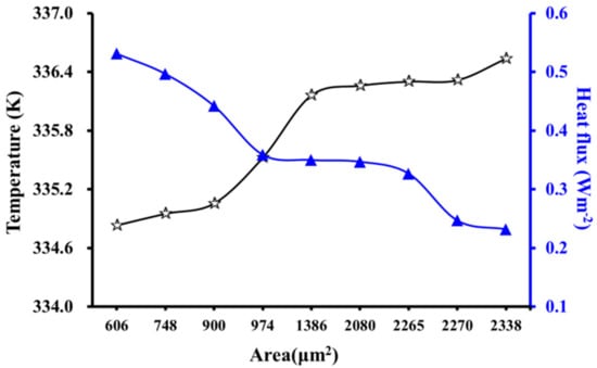 The observed temperature changes for different cell geometries indicated that the cross-sectional area influences the thermal behavior. Figure 12 shows that the temperature increased with increasing area of the unit cell. A similar conclusion was drawn by Lin et al. [35], who derived an equation for the temperature field distribution during the heat transfer process in anisotropic wood, where the temperature (t) at any point (r) in the wood during heat transfer could be calculated as follows: