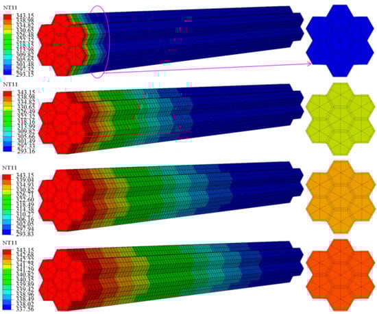 In this section, the influence of the heat transfer direction on the temperature properties is discussed. Here, θ was fixed at 30°, T and R were fixed at 30 μm, and the applied temperature was 343.15 K. Figure 14 shows the temperature field distribution of a tracheid in the longitudinal direction at times of 1.2 × 10−2, 7.8 × 10−1, 1.8, and 120 s, where the 2D cross-sections on the right show the results at 0.18 mm from the heating surface. The temperature field distribution over each cross-section was consistent along the entire longitudinal direction of the tracheid. The initial temperature of 343.15 K only appeared on the first heating surface; the temperature steadily decreased with increasing distance from the initial surface. Therefore, attenuation of heat in the tracheid increased with increasing distance from the heating surface. As the heat was transferred over time, all cross-sections over the entire tracheid eventually reached 338.15 K, as shown by the 2D cross-sections, where the temperature of 293.15 K at 1.2 × 10−2 s increased to 338.15 K after 120 s.