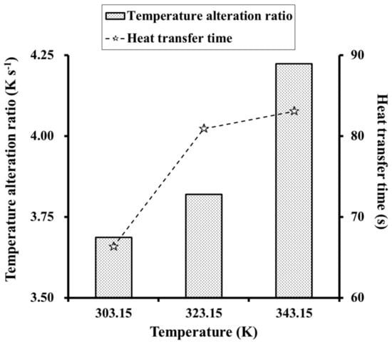 Figure 11 shows the temperature alteration ratio (TAR) and heat transfer time of the last cross-section in the longitudinal direction at 343.15 K. The TAR is defined as follows, where is the initial temperature at time and is the temperature at .