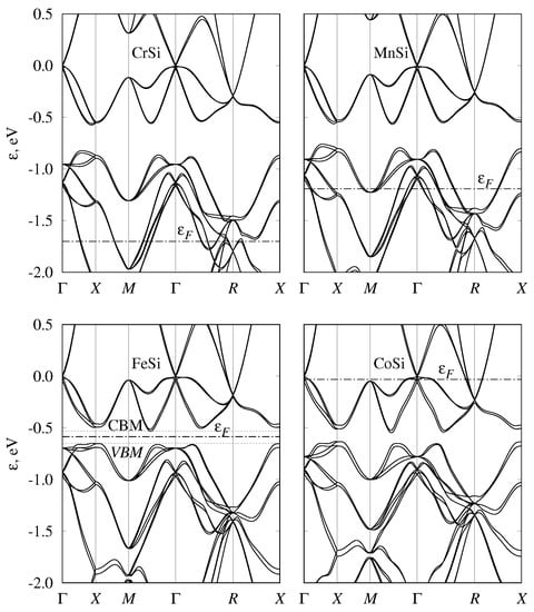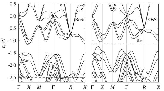 - Shaposhnikov, V.L.; Migas, D.B.; Borisenko, V.E.; Dorozhkin, N.N. Features of the band structure for semiconducting iron, ruthenium, and osmium monosilicides. Semiconductors 2009, 43, 142–144. [Google Scholar] [CrossRef]