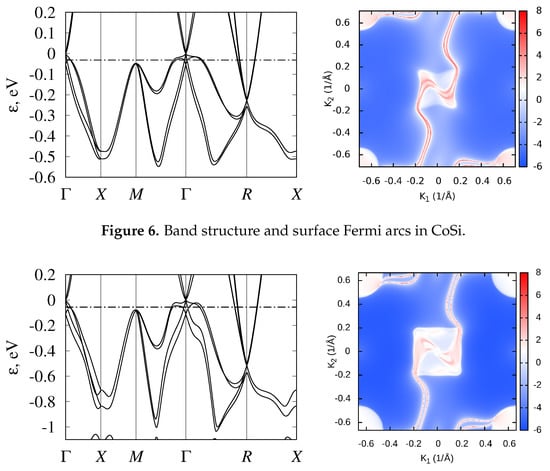 - Pshenay-Severin, D.A.; Ivanov, Y.V.; Burkov, A.A.; Burkov, A.T. Band structure and unconventional electronic topology of CoSi. J. Phys. Condens. Matter 2018, 30, 135501. [Google Scholar] [CrossRef] [PubMed]