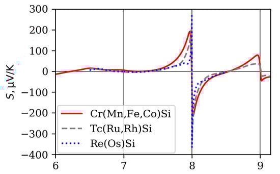 - Sakai, A.; Ishii, F.; Onose, Y.; Tomioka, Y.; Yotsuhashi, S.; Adachi, H.; Nagaosa, N.; Tokura, Y. Thermoelectric power in transition-metal monosilicides. J. Phys. Soc. Jpn. 2007, 76, 093601. [Google Scholar] [CrossRef]