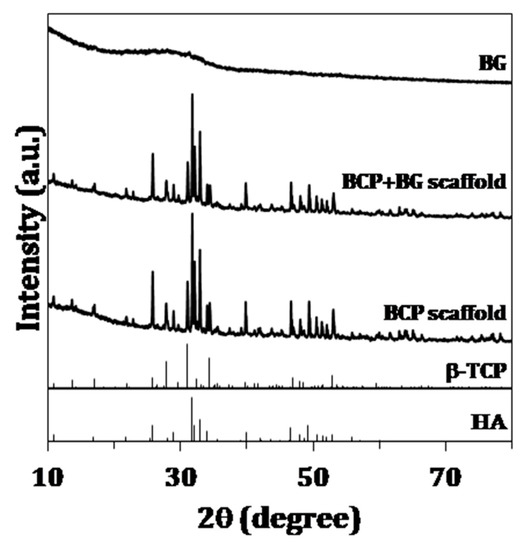 Sol-gel derived bioactive glasses (BG), biphasic calcium phosphates (BCP) scaffolds and BG-coated scaffolds. The standard diffraction patterns of β-tricalcium phosphate (β-TCP) and hydroxyapatite (HA) standards, ICDD PDF 04-006-9376 and 04-015-7245, respectively, are also present for comparison purposes.