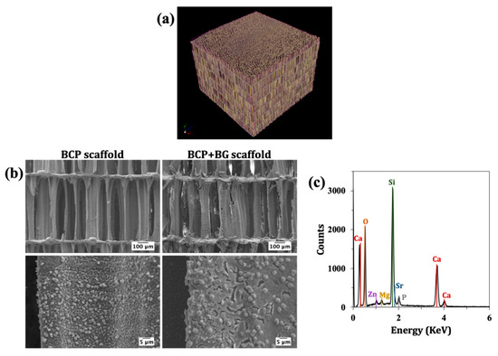 Microstructural and chemical features of the scaffolds: (a) µ-CT image showing the microstructure of raw cuttlefish bone (CB) highlighting its interconnected porosity; (b) SEM micrographs of uncoated and coated BCP scaffolds; (c) energy dispersive spectroscopy (EDS) analysis of the sol-gel derived BG coating.