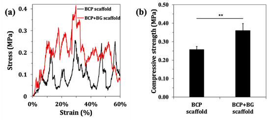 Compressive strength of the uncoated and BG-coated BCP scaffolds: (a) representative stress-strain curve; (b) maximum compressive strength during the deformation period. The results are represented as the mean ± SD (** P < 0.01).