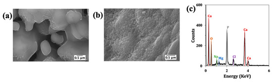 Microstructural and chemical features of the scaffolds after 14 days of immersion in simulated body fluid (SBF) solution: (a) SEM micrograph of uncoated BCP scaffolds; (b) SEM micrograph of BG-coated BCP; (c) EDS analysis of the precipitate.