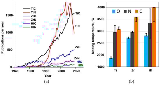 (a) Number of publications per year on carbides and nitrides of titanium group transitional metals (1940–2018 Chemical Abstract database). (b) The preferred values for melting temperatures of Ti, Zr, and Hf carbides and nitrides with NaCl-type structure. See Section 4 for references. The “error bars” indicate the range of previously reported values for melting temperatures from Berg et al. [7].
