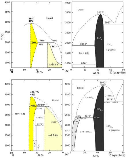 Binary phase diagrams for condensed system of Zr and Hf with graphite and nitrogen (at 1 atm pressure), redrawn after: (Zr-N)—Ma et al. (2004) [57]; (Zr-C)—Gullerment (1995) [58]; (Hf-N)—Okamoto (1990) [59]; (Hf-C)—Bittermann and Rogl (1997) [60].
