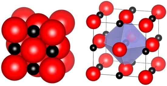 The rocksalt structure (Figure 3) can be described as two face-centered cubic lattices of metal and nonmetal moved with respect to each other or as a metal cubic close-packed structure with all octahedral voids occupied by nonmetal. The space group is Fm3m, with coordinates for all atoms defined by space group symmetry: the metal at 0, 0, 0 and the nonmetal at ½, ½, ½. Four formula units make up the conventional cubic unit cell (Z = 4). The structure can accommodate vacancies on both metal and non-metal sublattices. The carbon-to-metal ratio in Zr and Hf carbides is always less than or equal to 1; thus, their formula is often written as MeC1−x. This formula does not mean that there are no vacancies on the metal sublattice; it only indicates that there are typically fewer vacancies on metal sublattice than on the carbon sublattice. A notable exception is the case of nitrides, since compositions with nitrogen excess, up to HfN1.2 have been reported in the rocksalt structure [126]. The formula could equivalently be written as Hf1−xN, to indicate that the vacancies are predominantly on the metal sublattice.