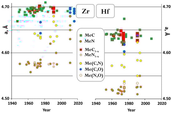 Figure 4 shows reported lattice cell parameters for Zr and Hf carbides nitrides and their solid solutions. The considerable variation in cell parameters for nominally ZrN composition reported in recent years is likely related to the fact that the thin films samples were produced by CVD and PVD. Due to analytical difficulties in quantifying ratios of C, N, and O in nonstoichiometric carbonitrides, it is tempting to establish lattice parameter composition relations for (oxy)carbonitrides, and many analytical expressions were derived and reported in separate studies [55,81,113,114,134]. However, these parametrizations are likely to be useful only within a set of samples arising from the same synthesis procedure. Cell parameter for Zr and Hf carbides can be lowered by either carbon deficiency, or by O or N substitution. To complicate things even further, the lattice parameter of ZrCx as a function of C content shows a maximum at x = 0.8, while this is not observed for HfCx (Figure S1). Hydrogen can also be incorporated in the vacancies of the nonmetal sublattice without a significant effect on the lattice parameter [35]. In this respect, the few reports on the formation enthalpies of these compounds discussed below are valuable references, since in order to derive formation enthalpies from heats of combustion, initial samples, and combustion products were thoroughly characterized, often using a combination of different techniques.