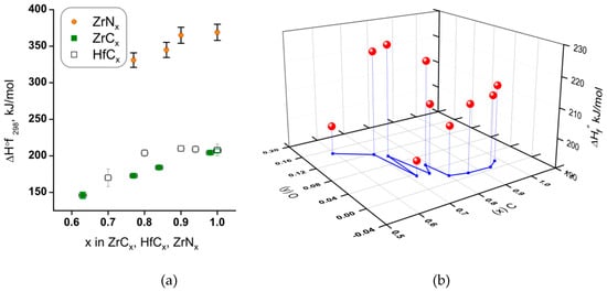 (a) Standard enthalpies of formation of Zr and Hf carbides and Zr nitrides as a function of carbon content. (b) Standard enthalpies of formation of 10 hafnium oxycarbides HfCxOy plotted measured by Kornilov et al. [125], from which the values for HfCx were derived. Note that the oxygen content reaches y = 0.15 for most carbon deficient composition. See Tables S3 and S4 for reported uncertainties.