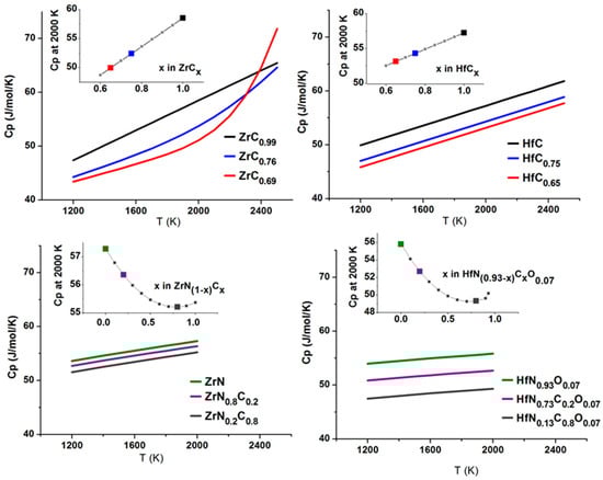High temperature heat capacity (Cp) of zirconium and hafnium carbides and carbonitrides after Turchanin (1991) [30]. The insets show isotherms of heat capacity at 2000 K versus composition. Temperature dependence for selected compositions is shown on the main graphs. The data are tabulated in supporting information (Tables S6 and S7).