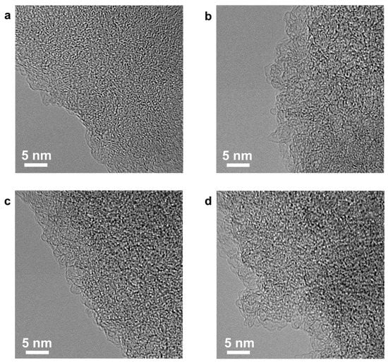 In a chemical activation process, four different samples were prepared by controlling the contents of the activation agent from 200 to 800 wt.% (vs contents of the precursor material). The resulting products are called NE2-C-AEMs, NE4-C-AEMs, NE6-C-AEMs, and NE8-C-AEMs according to the weight ratio of the activation agent to the precursor. The morphologies of the NE-C-AEMs were similar to their precursor materials because the cellulose-based precursors were a char-type material that does not undergo a melting phase during the thermal transition process (Figure 1). In addition, they all showed a highly disordered carbon structure without long-range ordering, as shown in the high-resolution field emission transmission electron microscopy (FE-TEM) images (Figure 2). The disordered structures were examined further by Raman spectroscopy and X-ray diffraction (XRD) (Figure 3a,b). In the Raman spectra, the four different samples exhibited two distinct connected peaks corresponding to D (A1g breathing mode) and G (E2g vibration mode) bands at ~1330 and ~1600 cm−1, respectively (Figure 3a). The broad and fused peaks indicated the presence of highly defective PHC structures [27]. In contrast, their XRD patterns showed no distinctive peak, indicating poor three-dimensional graphitic ordering (Figure 3b). Basically, carbon-based materials prepared from a polymer-based precursor material using a relatively low temperature pyrolysis process (<1000 °C) have a highly amorphous structure composed of defective polycrystalline PHC building blocks [28]. The sp2-structured PHC components were damaged further by metallic potassium-mediated chemical activation, leading to the formation of a large number of sp3 carbon rings, such as pentagons, hexagons, heptagons, and so forth. The topological defects formed in the PHC structures highly distorted the two-dimension-like PHCs, causing numerous (sub-)nano-meter-sized pores between the not well-stacked PHCs [29,30]. Although it is difficult to exteriorize the defective carbon structures by FE-TEM, Raman spectroscopy, and XRD, it is clear that the pore structures of C-AEMs are altered significantly by the degree of activation.
