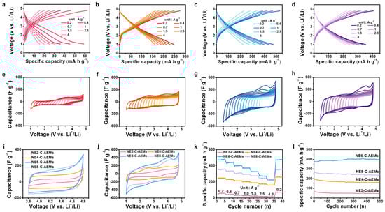 Electrochemical properties of the NE-C-AEMs in an electrolyte of 1 M LiPF6 dissolved in an EC/DMC mixture solution (1:1 v/v) as a positive electrode for LIBs. Galvanostatic charge/discharge profiles of (a) NE2-C-AEMs, (b) NE4-C-AEMs, (c) NE6-C-AEMs, and (d) NE8-C-AEMs. CV curves of (e) NE2-C-AEMs, (f) NE4-C-AEMs, (g) NE6-C-AEMs, and (h) NE8-C-AEMs in different voltage ranges. CV curves of NE-C-AEMs voltage ranges of (i) 3.8~4.8 V and (j) 1.0~4.8 V. (k) Rate capabilities of NE-C-AEMs in a current range from 0.2 to 4.0 A·g−1 and (i) Cycling behaviors over 500 cycles.