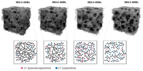 The schematic image shown in Figure 5 describes the experimental results. Heteroatoms present in accessible internal surfaces could have redox activity for lithium ions. In contrast, a smaller pore diameter <~2 nm has no redox activity for lithium ions in a positive voltage section as well as EDL capacitance, as observed in the NE2-C-AEMs sample. These results suggest that in a positive voltage section (1.0~4.8 V vs Li+/Li), the two factors (≥2 nm nanopores and redox-active heteroatoms) are a core for the pseudocapacitive lithium-ion storage behaviors. Figure 4k presents the rate capabilities characterized in the current range from 0.2 to 4.0 A·g−1. The specific capacities of NE-C-AEMs decreased gradually with increasing current density. In addition, the relatively EDL capacitance-dominant NE4-C-AEMs and NE8-C-AEMs showed superior rate capabilities to that of NE6-C-AEMs. At 1.0/4.0 A·g−1, 30/15, 201/160, 370/225, and 294/220 mA·h·g−1 were achieved for NE2-C-AEMs, NE4-C-AEMs, NE6-C-AEMs, and NE8-C-AEMs, respectively (Figure 4k). The NE6-C-AEMs and NE8-C-AEMs showed higher specific capacities than those (>200 mA·h·g−1) of conventional cathode materials, even at high current densities of 4 A·g−1, demonstrating the high rate performance of C-AEMs as a positive electrode for LIBs. Moreover, the cycling stabilities of the NE-C-AEMs were maintained for more than 300 cycles (Figure 4l).