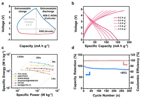 Electrochemical performance of GNS//NE6-C-AEM full cells in an electrolyte of 1 M LiPF6 dissolved in EC/DMC mixture solution (1:1 v/v) over a voltage window between 0.01 and 4.8 V. (a) Schematic image of the respective galvanostatic voltage profiles of GNS anode and NE6-C-AEM cathode in the full cell system. (b) Galvanostatic charge/discharge profiles at different current densities. (c) Ragone plots of several energy storage devices, including GNS//NE6-C-AEM cells, and (d) capacity retention and coulombic efficiency results over 300 continuous cycles.