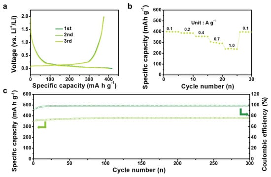 Electrochemical performances of GNS anode in an electrolyte of 1 M LiPF6 dissolved in an EC/DMC mixture solution (1:1 v/v) over a voltage window of 0.01~2.0 V vs Li+/Li. (a) Galvanostatic discharge/charge profiles, (b) Rate capabilities in current densities from 0.1 to 1.0 A·g−1, and (c) Cycling behaviors over 300 cycles.