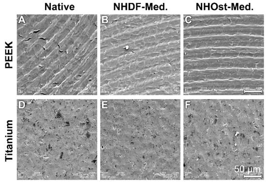 The analysis of the untreated PEEK samples revealed that the surfaces had a characteristic grinding pattern (Figure 1A). Even after culture in NHDF and NHOst media, the indentations were still clearly visible (Figure 1B,C).