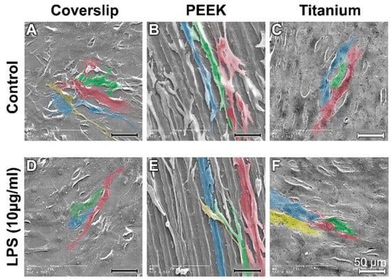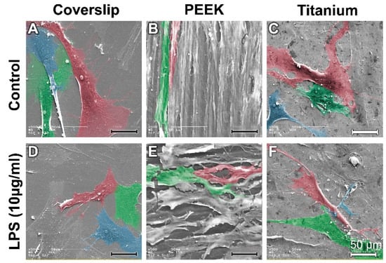 Under the influence of LPS, the NHOst formed numerous fine thin cytodendrites on the coverslips (Figure 2D). The osteoblasts also contracted on the PEEK and titanium samples to a greater extent than those grown on coverslips (Figure 2E,F).