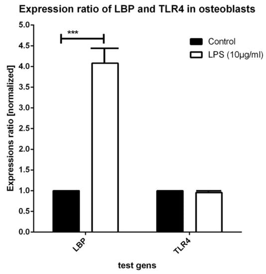 With regard to cDNA expression of LBP, a considerably greater increase was measured in the NHOst cultures that had been stimulated with LPS when compared with the corresponding controls. However, the TLR4 expression in the osteoblasts was not altered under treatment with LPS.