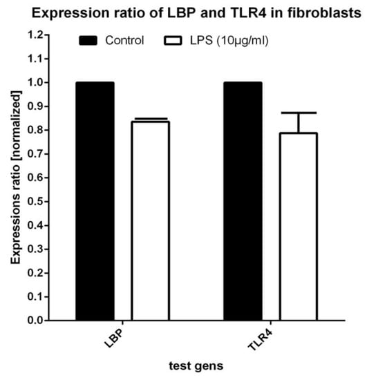 The LPS incubation of fibroblasts resulted in slight reductions in their LBP and TLR4 cDNA concentrations, although these reductions were not significant. A study conducted on the human gingiva revealed that a 10 µg/mL LPS incubation led to the largest increase in the mRNA concentrations for LBP and TLR4 [62].