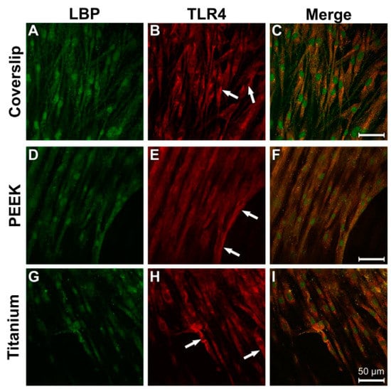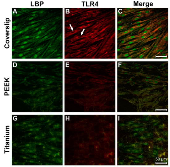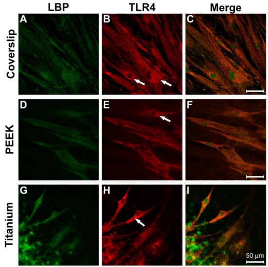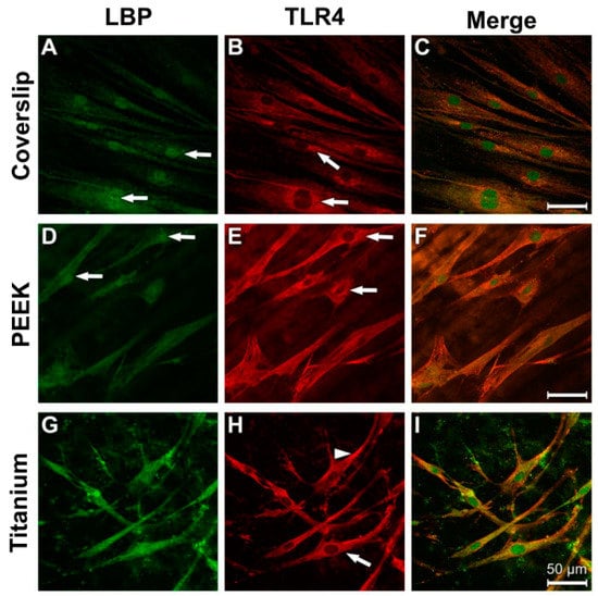 After LPS incubation, the greatest intensity of the antibody fluorescence against LBP and TLR4 was discernible in the perinuclear region of the cells grown on coverslips and the PEEK samples (Figure 7A,B,D,E; arrow). The elongated cytodendrites were also clearly immunostained on titanium (Figure 7H, arrowhead). The fluorescence intensity on all three of the materials was stronger than that under the corresponding control conditions.