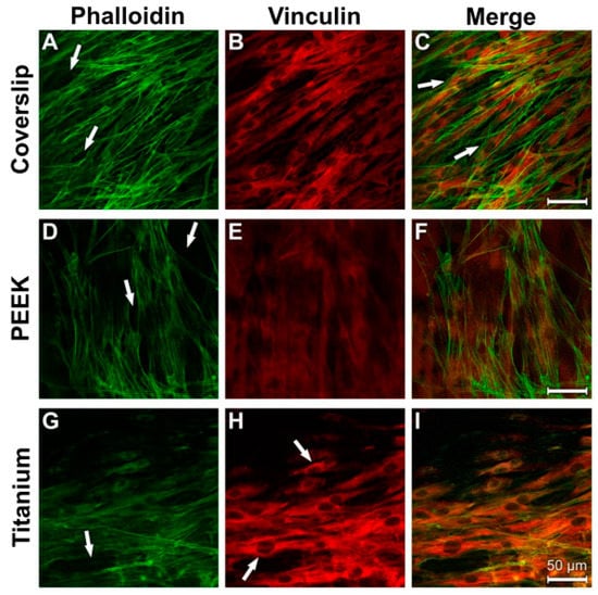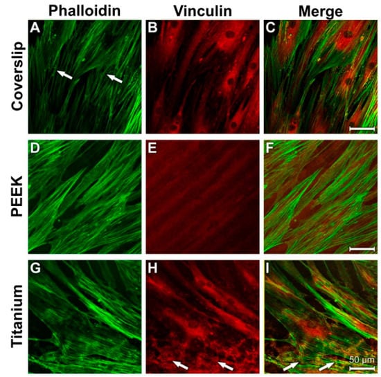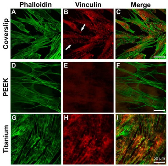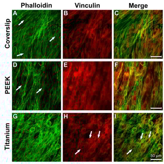 Staining of actin cytoskeleton and cell adhesion contacts in osteoblasts under control culture conditions. (A) Coverslip Phalloidin; (B) Coverslip Vinculin; (C) Coverslip Merge; (D) PEEK Phalloidin; (E) PEEK Vinculin; (F) PEEK Merge; (G) Titanium Phalloidin; (H) Titanium Vinculin; (I) Titanium Merge.