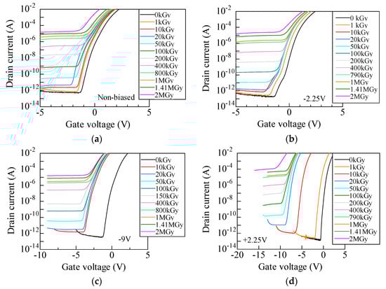 ID–VG curves in the subthreshold region for irradiated SiC MOSFETs for (a) unbiased, (b) −2.25 V, (c) −9 V, and (d) +2.25 V. These were measured applying a drain voltage of 10 V.