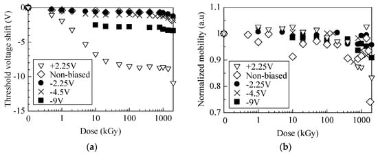 The threshold voltage shift ΔVth is plotted as a function of dose. Vth is calculated by linear extrapolation of the square root of ID–VG curves in the saturation region. ΔVth is the voltage shift from the initial Vth of each sample before irradiation. In Figure 2a, ΔVth of unbiased and negative biased samples slightly decreased up to 20 kGy and the +2.25 V biased sample decreased up to 50 kGy, and further negative shift is observed over 1 MGy. Observed shift above 1 MGy was caused by an increase of the density of hole traps in the oxide, probably as a result of cleavage of the Si–N bond [6].