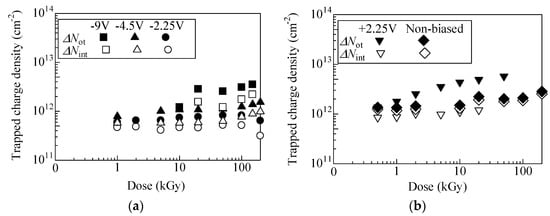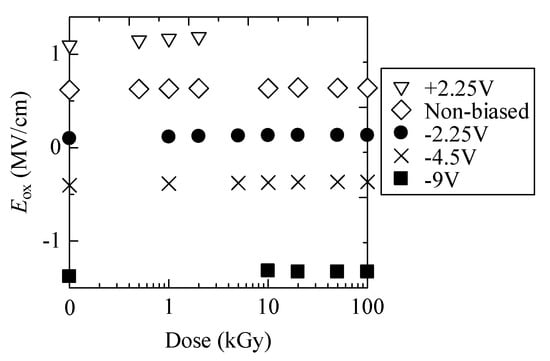 Figure 3 is the estimated electric field formed in the gate oxide (Eox) during irradiation. For unbiased and negative biased cases, Eox slightly increased up to 10 kGy and no significant change was observed with further irradiation. As shown in Figure 3, Eox for −2.25 V is approximately 0 and Eox for −4.5 V is slightly negative. For +2.25 V, we cannot obtain values above 5 kGy since large negative shift of ID–VG curves inhibits to calculate Ψs at VG = 0 V.