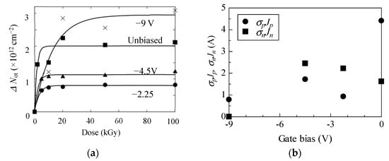 Accumulation and annihilation behavior of holes in the oxide were investigated by least square fitting of obtained ΔNot curves. On the basis of ΔNot of +2.25 V biased sample below 2 kGy, the density of hole trap in the oxide, Nt, was calculated using Equation (4). In such a low dose region, the annihilation effect (second term of Equation (4)) could be negligible. Least square fitting of plots of ΔNot gives Nt of 2.7 × 1012 cm2, which is somewhat smaller than the reported Nt of 4.50 and 8.50 × 1012 cm [22]. Figure 5a shows experimental plots and estimated curves of ΔNot for unbiased and negative biased samples. We maintain the view that ΔNot estimated from experimental results essentially follow Equation (4), although the experimental uncertainties should be improved. Estimated σpJp and σnJn are also plotted as a function of the gate bias in Figure 5b, respectively. σnJn of negative biased samples slightly increased for −2.25 and −4.5 V biased cases relative to unbiased case. Since σnJn is annihilation probability of a trapped hole, this indicates that annihilation behavior was not significantly affected by application of these negative biases, while σpJp is less than half of the unbiased one. As the absolute value of the oxide electric field (Eox) for these negative biased samples was smaller than the unbiased case, as shown in Figure 3, the yield of hole due to irradiation is expected to be smaller [20]. Additionally, smaller Eox might suppress movement of generated holes toward SiC/oxide interface, at which many hole traps exist. Thus, for −2.25 and −4.5 V biased cases, relatively lower σpJp was obtained. Further increasing the negative bias up to −9 V, Eox becomes larger, as seen in Figure 3. Nevertheless, remarkable increase of σpJp was not observed and the annealing effect was not extracted from the fitting results. These suggest that most of the hole traps are located close to the SiC/SiO2 interface [35]. Due to the suppression of movement of holes toward the interface by negatively large Eox, a portion of holes generated by irradiation could be trapped. Low annealing effect is also interpreted as formation of traps too far from the gate electrode. They were beyond the reach of electrons coming from the gate electrode.