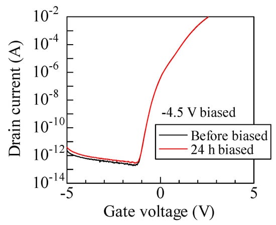 ID–VG curves in the subthreshold region for biased SiC MOSFETs without irradiation. For ID–VG measurement, drain voltage of 10 V were applied.