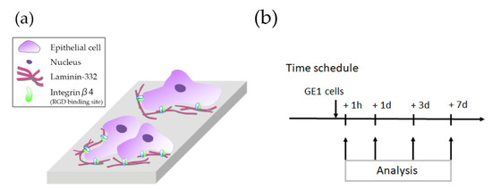 (a) Adhesion assay of GE1 cells. Data are shown as the mean ± SD. Statistical analysis was by t-test (** p < 0.01). (b) Immunofluorescence staining of GE1. Actin filaments (red), nuclei (blue), and integrin β4 (green) are shown (bar = 60 µm).