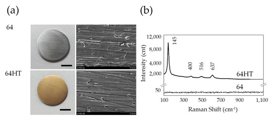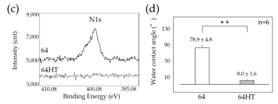 There were no statistically significant differences in the Ra and Rt values between 64 and 64HT (Table 1). The 64HT samples exhibited a gold color (Figure 2a). SEM observation at magnification of 3000 times showed no clear change after the 64HT treatment (Figure 2a), and the grooves of mechanical polishing could be seen. In surface crystal structure analysis, 64 was similar to an amorphous peak which appears non-crystalline, and 64HT was similar to an anatase-type titanium oxide peak (Figure 2b). N1s peak in the XPS spectra of the 64 was observed around 400 eV on the surface, but was not observed on 64HT (Figure 2c). The water contact angle for the evaluation of surface wettability on the 64HT was significantly lower than that on the 64 (Figure 2d).