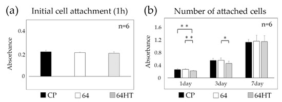 (a) Initial attachment of GE1 cells was analyzed 1 h following seeding. (b) The number of GE1 cells was analyzed after 1, 3, and 7 days of incubation. Data are shown as the mean ± SD. Statistical analysis was by ANOVA with Tukey’s test (* p < 0.05, ** p < 0.01).