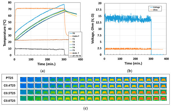 Changes in temperature: (a) time-dependent temperature at T0–T4, and at the heat source (cable temperature), and the ambient temperature and temperature gradient, (b) voltage and resistance of the cable while heat was applied, and (c) temperature distribution on the top surface measured using an infrared camera (every 20 min over the 6 h heating process). C0.4, C0.5, and C0.6: mortar composite with 0.4 wt %, 0.5 wt %, and 0.6 wt % of pitch-based carbon fiber, T25: 25 mm specimen thickness.