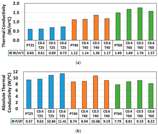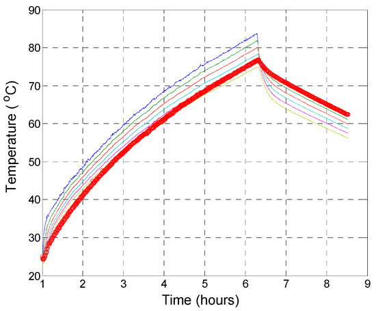where is the largest eigenvalue, and β = 2/3 based on the Crank–Nicolson method, which is unconditionally stable in Equation (7). This 1D transient heat transfer analysis was performed in the Matlab environment (MathWorks, Natick, MA, USA). The purpose of the analysis was to assess thermal conductivity experimentally and numerically. Figure 4 presents the results regarding transient heat transfer through panel C0.6T25 (0.6 wt %; thickness = 25 mm), and Table 4 presents the results regarding the conductivity and convective coefficient, kMatlab, and hMatlab respectively from the analyses. Because a narrow convective boundary surface (0.56 m × Thk.: transverse section where the heating cable is in and out from the specimen) was used to allow the inlet and outlet of the heating cable to enter at the bottom of the panel, the change in convective coefficient h must be limited. There was good agreement between the experimental and numerical results with respect to the change in coefficient h. The heat capacity and density of the composite panel were kept constant at c = 1000 J/kg·°C and ρ = 2110 kg/m3, respectively. The heat capacity c value would not alter much if the temperature gradient is not abruptly changed, especially under a normal temperature range, such as 100 °C. The typical heat capacity would be in the range of 880~1000 J/kg·°C [43]. However, this would be altered with a rapid rise of temperature, such as a fire. The density of the specimen was set to 2110 kg/m3, and this averaged value was measured by the authors.
