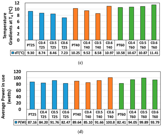 Measured properties: (a) thermal conductivity (W/m °C), (b) absolute thermal conductivity (W/°C), (c) temperature gradient, ΔT = T0 − T4, and (d) power (watts) in use for the heating process.