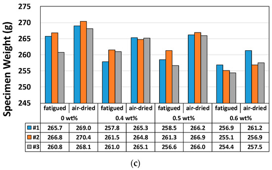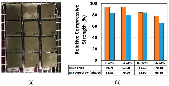 Freeze-thaw resistance of pitch-based carbon fiber-mortar composite: (a) 350 freeze-thaw cycles were applied at 50 mm× 50 mm × 50 mm (nine specimens with pitch-based carbon fiber content of 0–0.6 wt %), (b) relative strength relative to reference specimen strength (%) and (c) specimen weight (g): fatigued vs. air-dried specimen.