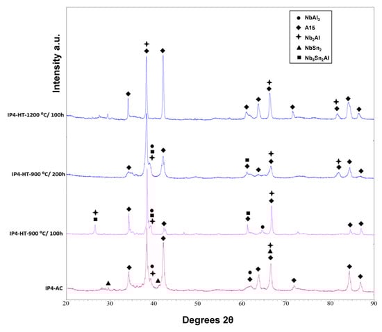 XRD showed that A15, NbSn2, NbAl3 and Nb2Al were present (Figure 1). The microstructure of the as-cast alloy (IP4-AC) can be seen in Figure 2a,b and the compositions of the constituent phases are shown in Table 2. Large areas of primary A15 phase were observed, while at the grain boundaries the three other phases were formed: NbSn2, NbAl3 and Nb2Al. The content of Al in A15 was ~10 at.% while in NbSn2 was ~7 at.%. The Sn content in NbAl3 and Nb2Al was nearly 4 at.% and 10 at.%, respectively. Areas of Sn-rich Nb2Al were evident (Figure 2b) with a Sn content of ~17 at.%. The Al/Sn ratio and Al + Sn sum in A15 were 0.67 and 25.5 at.%, respectively.