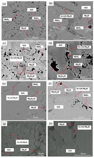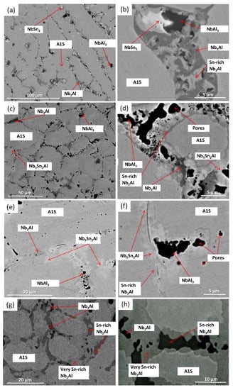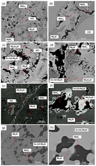 The IP6-AC alloy was annealed at 1200 °C for 100 h (IP6-HT-1200 °C/100 h). XRD showed only the presence of A15 and Nb2Al (Figure 7). The microstructure was significantly altered after this heat treatment compared with the as-cast. In the heat-treated sample, only A15 (matrix) and Nb2Al were observed. The NbSn2 and NbAl3 were no longer present, while the dark areas were pores (Figure 8g,h). Nb2Al again formed Sn-rich areas with larger volume fraction than the Nb2Al with low Sn content. As it can be seen in Table 4, the composition of A15 was approximately the same compared with the IP6-AC, with the Al/Sn ratio being 0.49 and Al + Sn sum being 26.0 at.%. Sn content in Nb2Al decreased by ~3 to 4.6 at.% compared with as-cast, while in Sn-rich Nb2Al the concentration of Sn increased by ~4 to ~21 at.%.